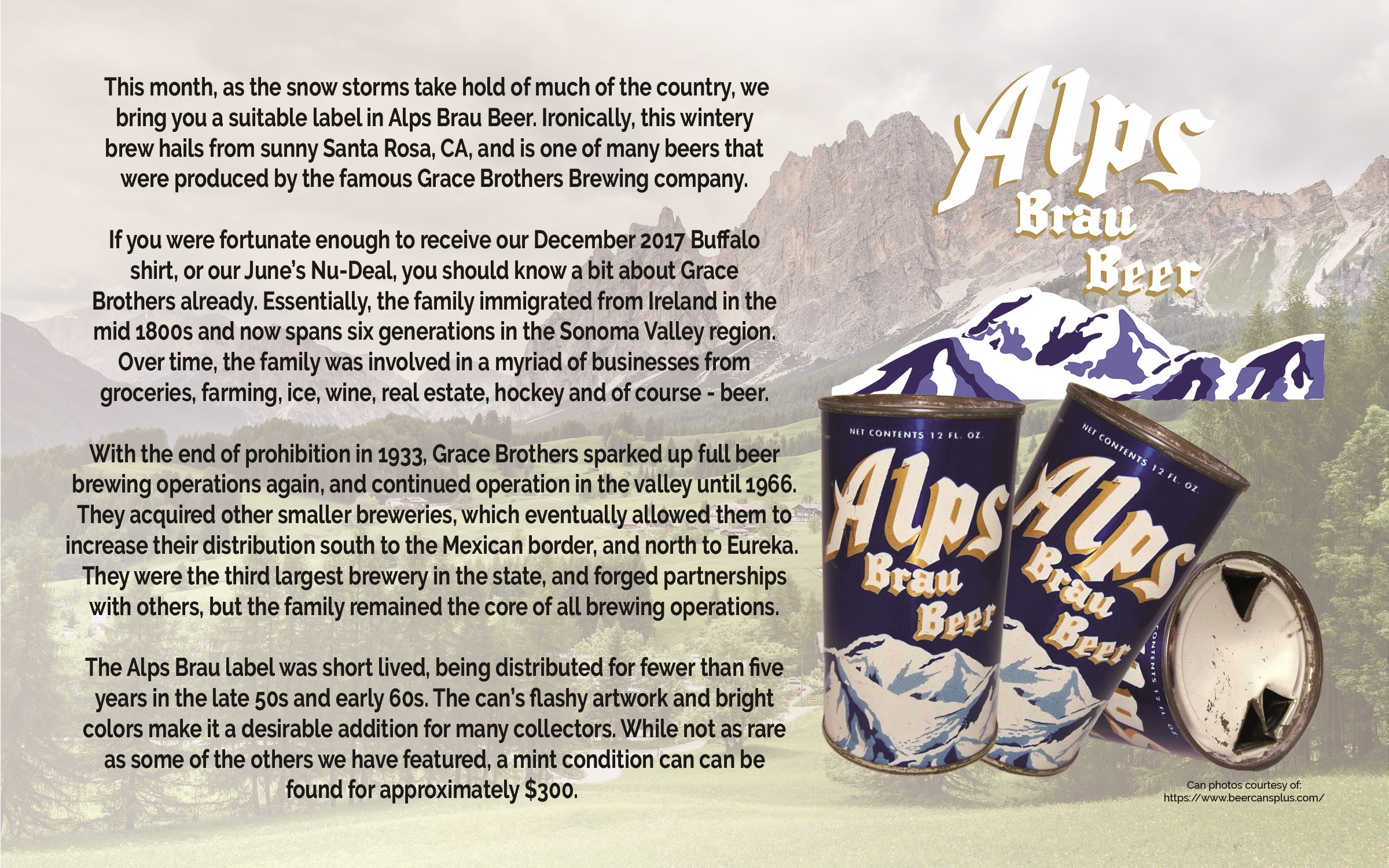 This month, as the snow storms take hold of much of the country, we bring you a suitable label in Alps Brau Beer. Ironically, this wintery brew hails from sunny Santa Rosa, CA, and is one of many beers that were produced by the famous Grace Brothers Brewing company.