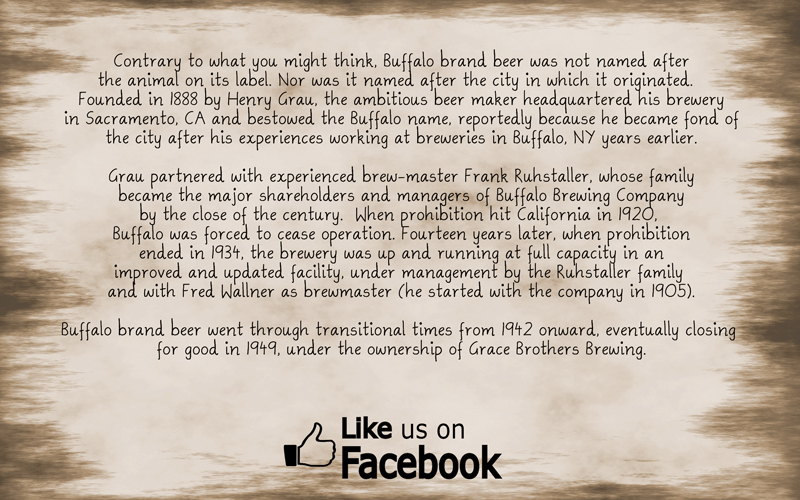 Contrary to what you might think, Buffalo brand beer was not named after the animal on its label. Nor was it named after the city in which it originated. Founded in 1888 by Henry Grau, the ambitious beer maker headquartered his brewery in Sacramento, CA and bestowed the Buffalo name, reportedly because he became fond of the city after his experiences working at breweries in Buffalo, NY years earlier.Grau partnered with experienced brew-master Frank Ruhstaller, whose family became the major shareholders and managers of Buffalo Brewing Company by the close of the century.