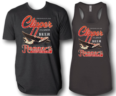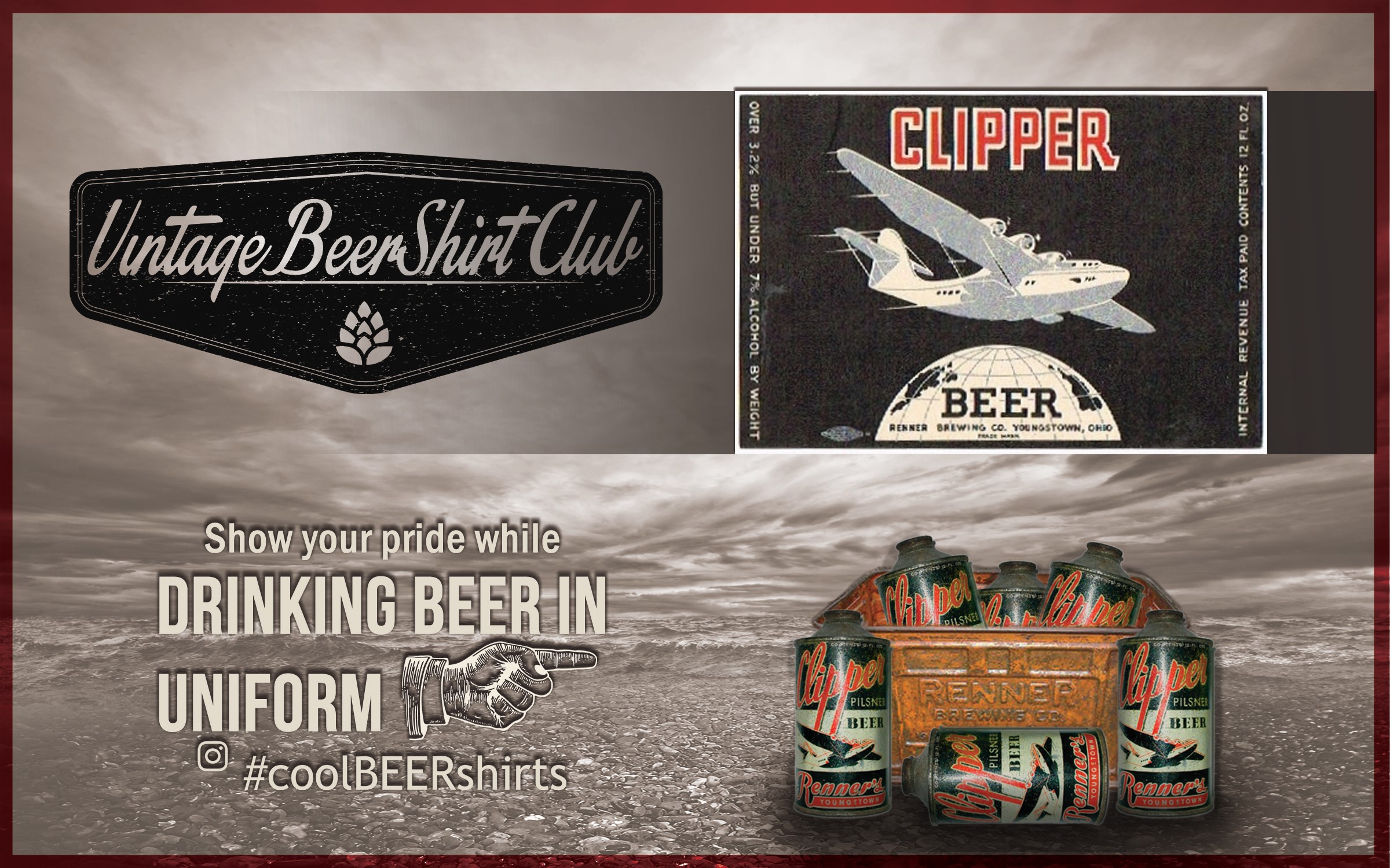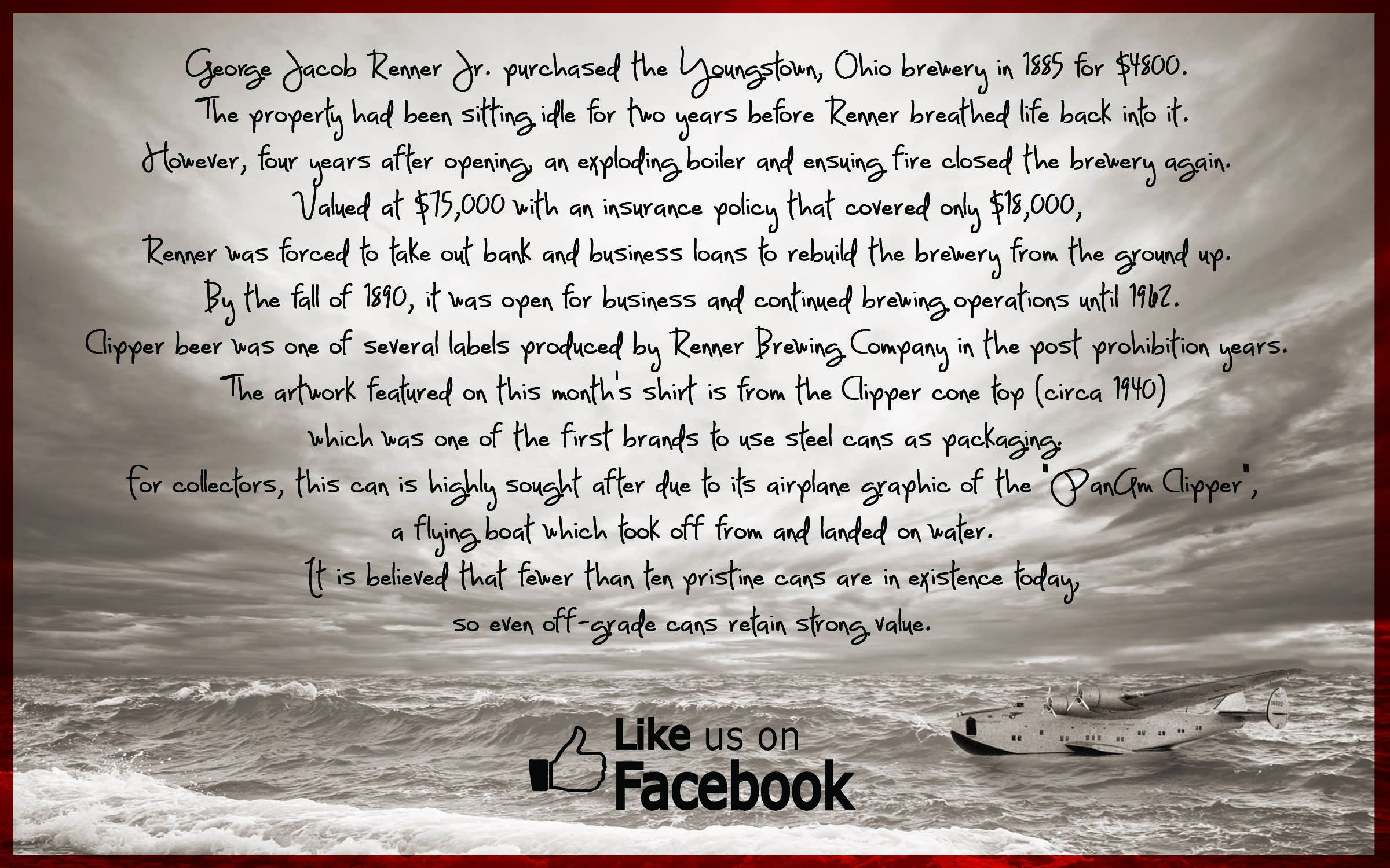 The artwork featured on this month’s shirt is from the Clipper cone top (circa 1940) which was one of the first brands to use steel cans as packaging.  For collectors, this can is highly sought after due to its airplane graphic of the “PanAm Clipper”, a flying boat which took off from and landed on water.