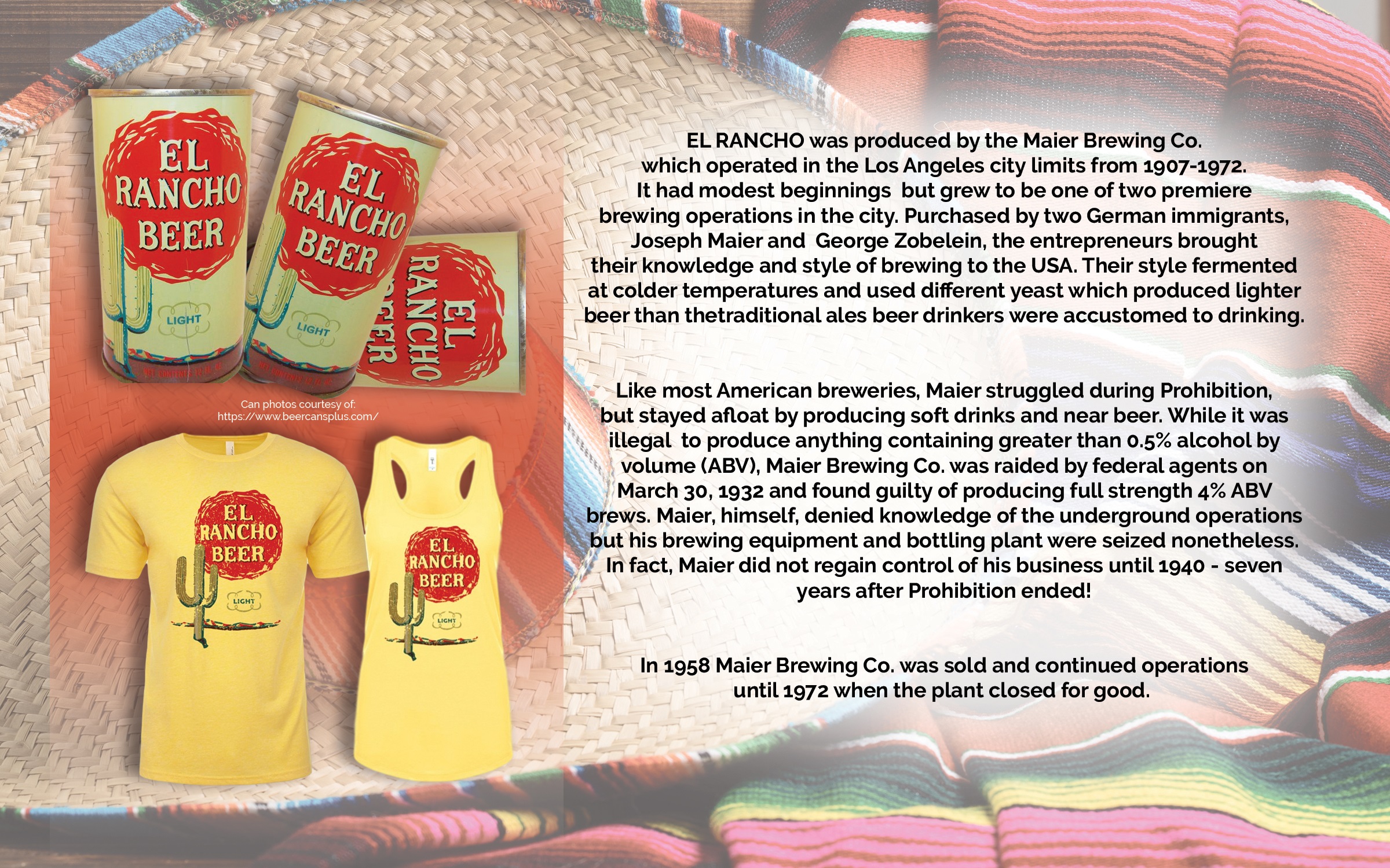 EL RANCHO was produced by the Maier Brewing Co. which operated in the Los Angeles city limits from 1907-1972.  It had modest beginnings  but grew to be one of two premiere brewing operations in the city. Purchased by two German immigrants, Joseph Maier and  George Zobelein, the entrepreneurs brought their knowledge and style of brewing to the USA. Their style fermented at colder temperatures and used different yeast which produced lighter beer than the traditional ales beer drinkers were accustomed to drinking.