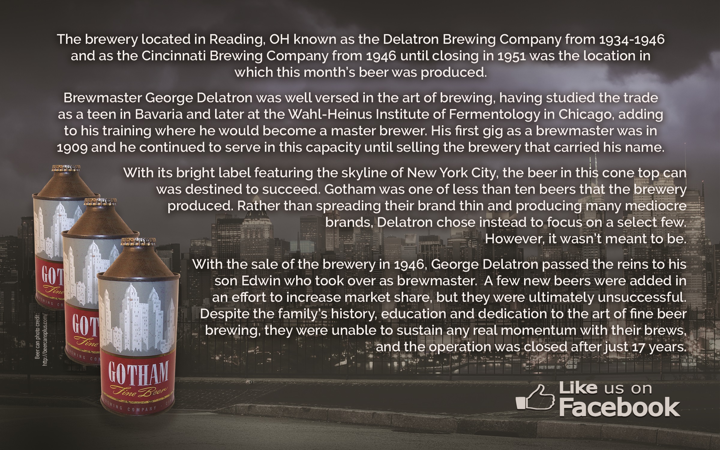 The brewery located in Reading, OH known as the Delatron Brewing Company from 1934-1946 and as the Cincinnati Brewing Company from 1946 until closing in 1951 was the location in which this month’s beer was produced.