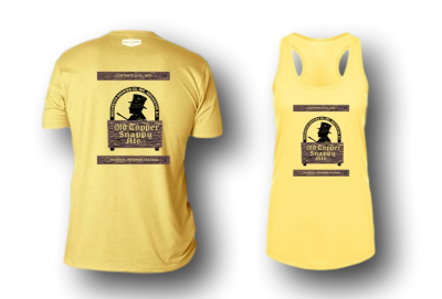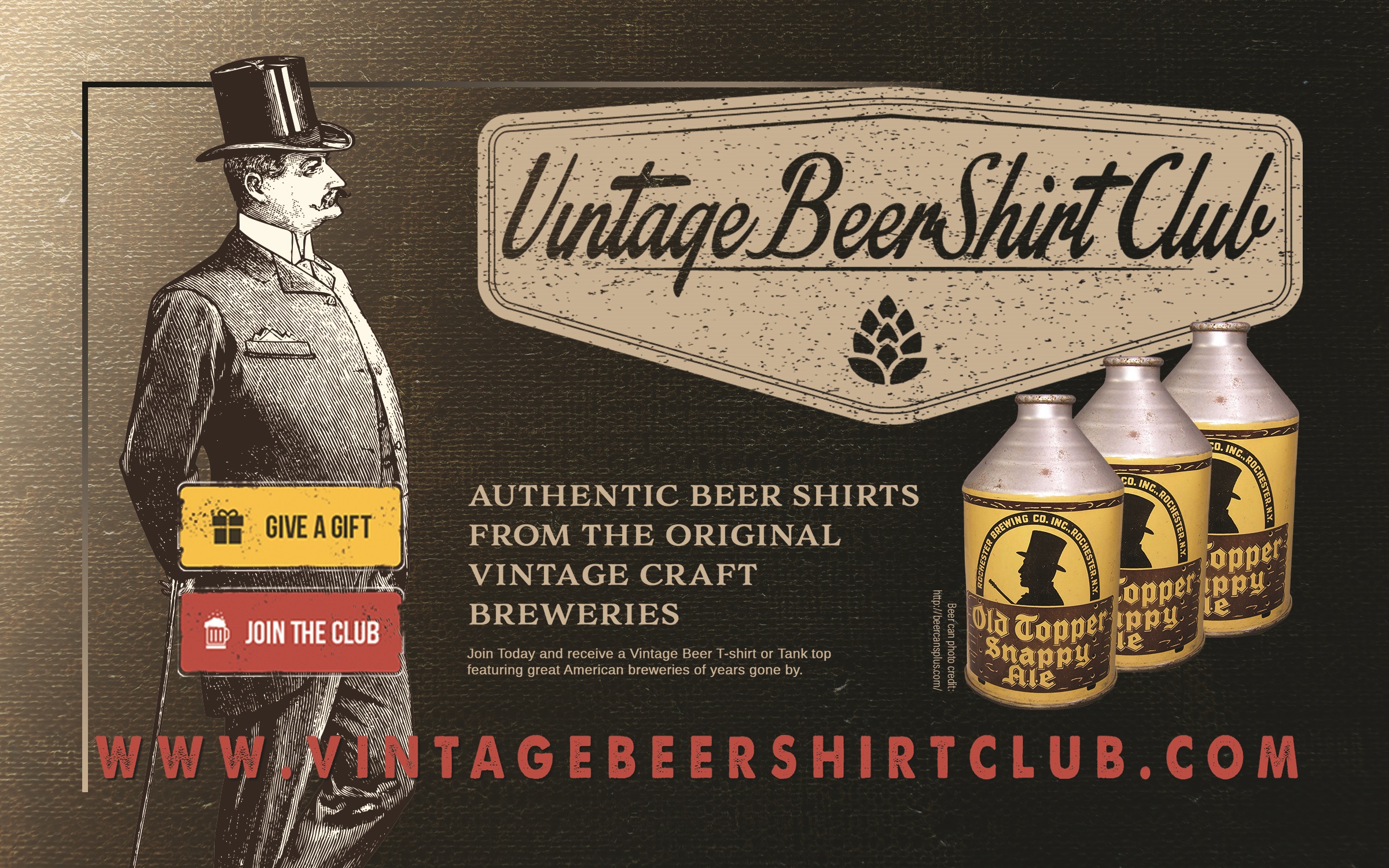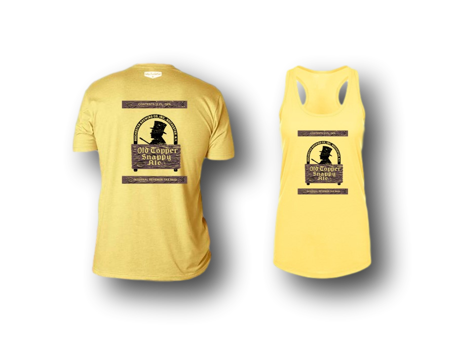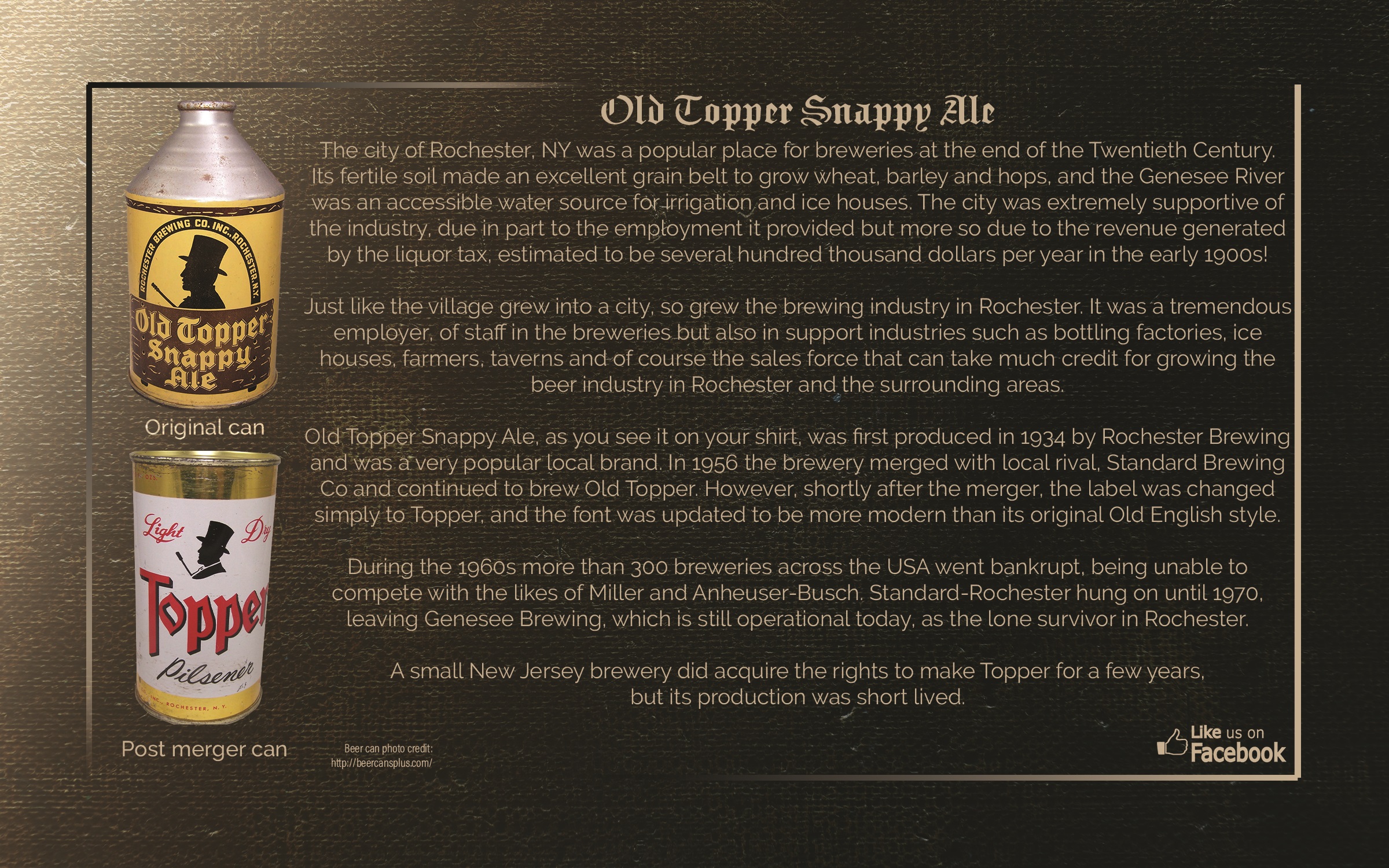 Old Topper Snappy Ale, as you see it on your shirt, was first produced in 1934 by Rochester Brewing and was a very popular local brand. In 1956 the brewery merged with local rival, Standard Brewing Co and continued to brew Old Topper. However, shortly after the merger, the label was changed simply to Topper, and the font was updated to be more modern than its original Old English style.