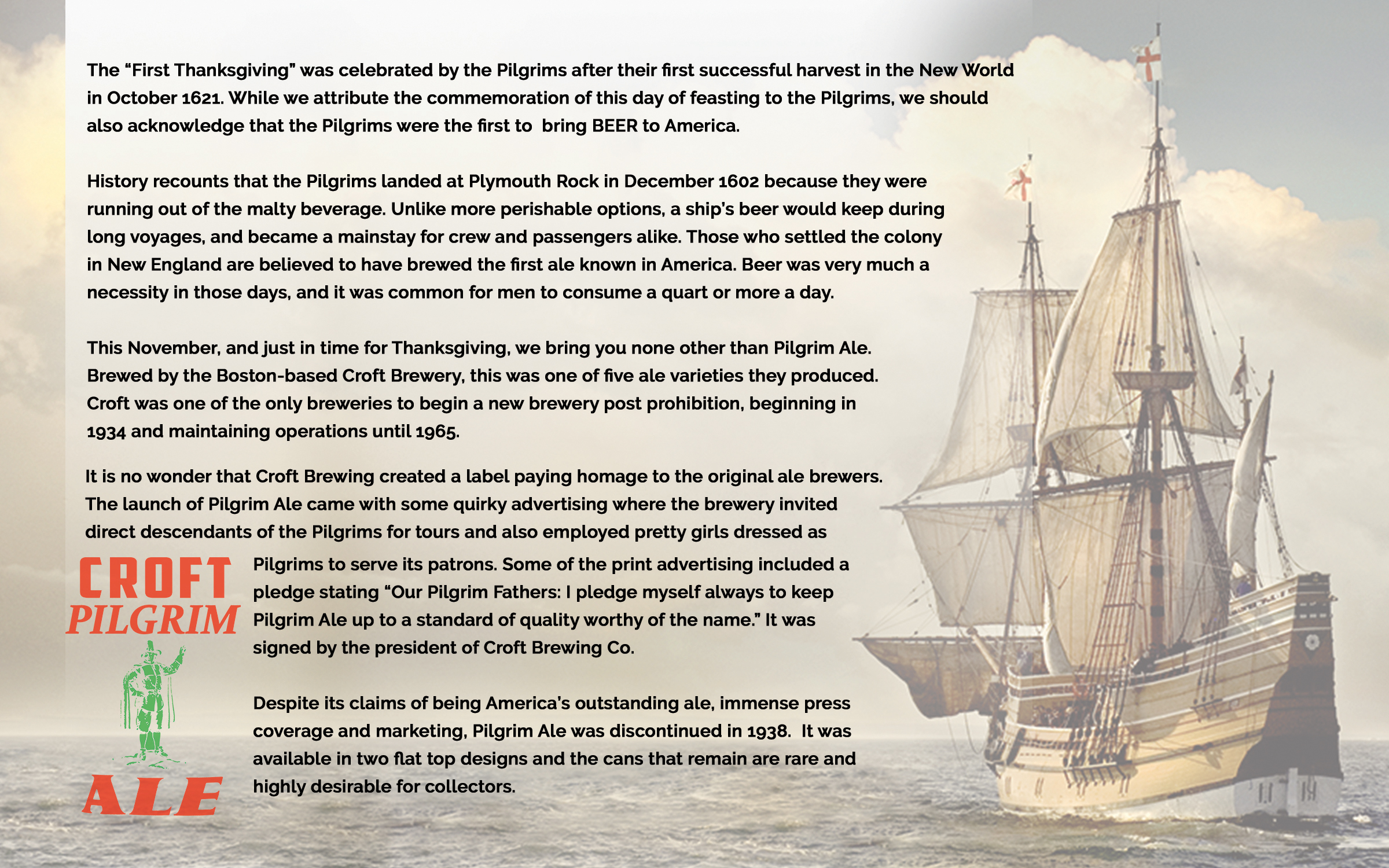 This November, and just in time for Thanksgiving, we bring you none other than Pilgrim Ale. Brewed by the Boston-based Croft Brewery, this was one of five ale varieties they produced. Croft was one of the only breweries to begin a new brewery post prohibition, beginning in 1934 and maintaining operations until 1965.