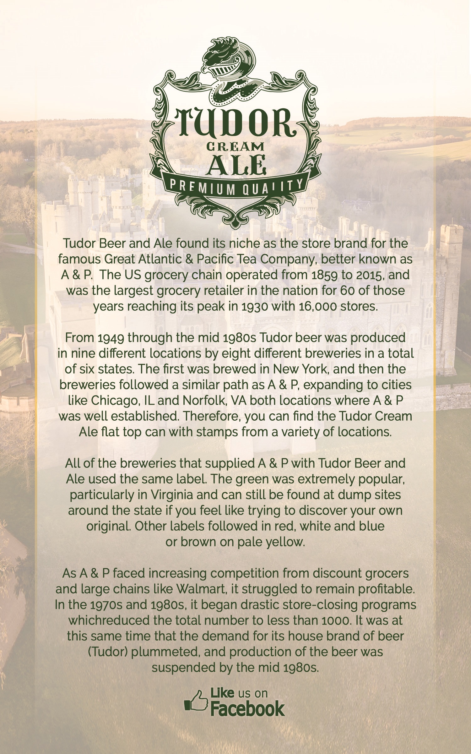 Tudor Beer and Ale found its niche as the store brand for the famous Great Atlantic & Pacific Tea Company, better known as A & P. The US grocery chain operated from 1859 to 2015, and was the largest grocery retailer in the nation for 60 of those years reaching its peak in 1930 with 16,000 stores.